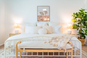1st Bedroom: The master bedroom boasts a comfortable king-sized bed for 2 guests, a spacious closet, and an ensuite full bathroom with his and her sinks, a toilet, and a bathtub with a shower.