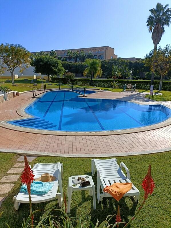 Guests love the resort facilities large garden, two swimming pools (one for children), tennis court, small playground, mini market, café/bar and restaurant just steps away.