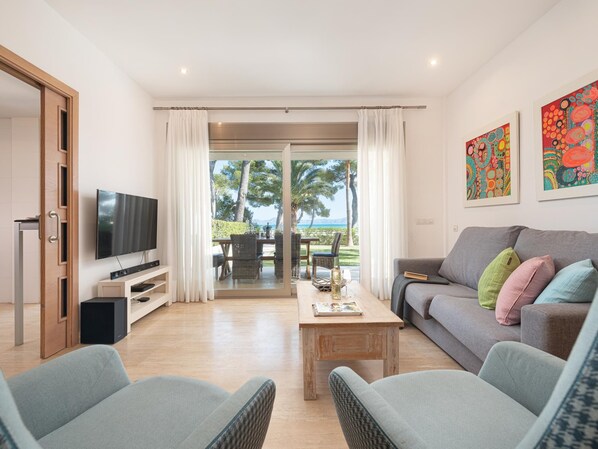 Bright living room with Smart TV, international channels, Netflix, and a comfortable sofa to relax after a day at the beach.