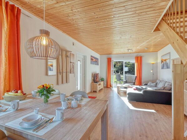 You will be staying in the "Sonnengarten 30" property, a 3-room house with a spacious and bright interior that features tasteful and cozy furnishings. The house spans 68 square meters across two levels. On the main level, there is a living/dining room equipped with a satellite TV (flat screen) and an exit leading to the terrace. The kitchenette is well-appointed with an oven, dishwasher, 4 ceramic glass hob hotplates, toaster, freezer, and an electric coffee machine. A shower/WC is also located on this level. Upstairs, you'll find two rooms with sloping ceilings: one room has a double bed, while the other room has two beds.