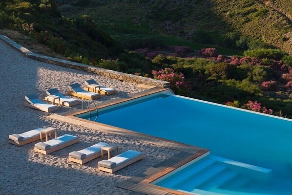 Aegea Blue Villa is a masterpiece of Cycladic architecture—an expansive 400 m² residence harmoniously built into the natural terrain of Andros to maximize the captivating views of the Aegean Sea. Designed on multiple levels, this striking home flows from the sea-facing ridge to the lush river basin below, offering a one-of-a-kind living experience.