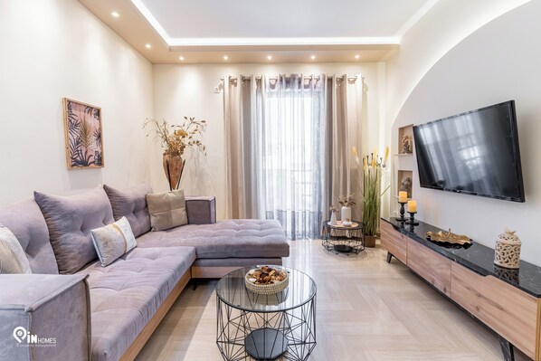 Elegant Design: A large, contemporary, open-plan living room with modern furnishings, quality linens, and two Smart TVs (in the living room and the bedroom).