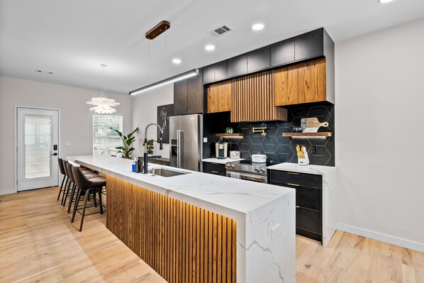 Cosmopolitan of Atlanta is prideful of being the most unique Boutique Hotel in West Side Atlanta for its design to give our guests an unforgettable experience when traveling to Atlanta. Our home has been a spotlight for many photographers and content creators. Each room offers a completely different feel. Entering the 8ft metal door, you’re greeted with an open concept living room, connecting to the custom built linear kitchen featuring a 15 ft island for lots of dining entertainment. Celebrate your special event with a chef of your choice while capturing the image with a mirror wall backdrop. The marble gold and black hexagon backsplash is picture worthy along with the handcrafted wood slat kitchen island and vent hood.