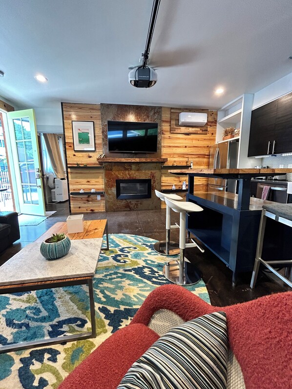 Living area with gas fireplace and AT&T premium U-verse cable/high-speed Wi-Fi. One designated off street parking space and plenty of street parking available.