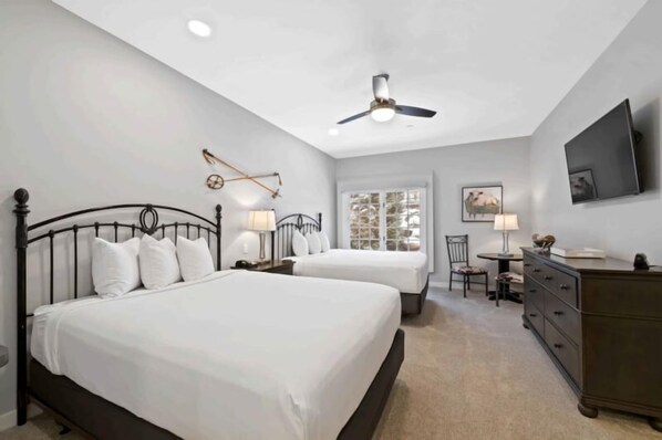 This tastefully decorated, ski-in, ski-out lodge room offers two queen size beds, a mini refrigerator, coffee maker and a full bathroom with custom tile work. Additional features include a ceiling fan, USB ports, a tabletop workspace, shared washer/dryer, and garage parking.