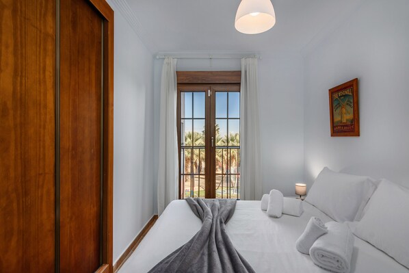 The 3 bedrooms have 5 beds (1 double and 4 singles) and the 2 full bathrooms have a bathtub. The apartment also has a children\'s play area and a shared community pool.