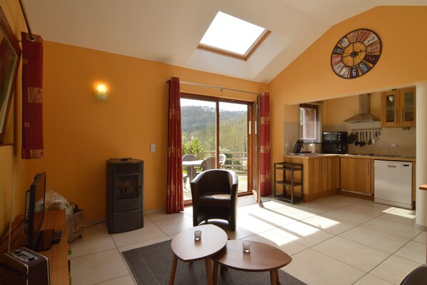 レイ���ウト:1階:(オープンキッチン(オーブン、電子レンジ、食器洗い機、冷凍冷蔵庫)、リビング/ダイニングルーム(コンロ(ペレット))、ベッドルーム(ダブルベッド)、バスルーム(シ���������洗面台)、トイ��)テラス、庭���庭家具、バーベキュー