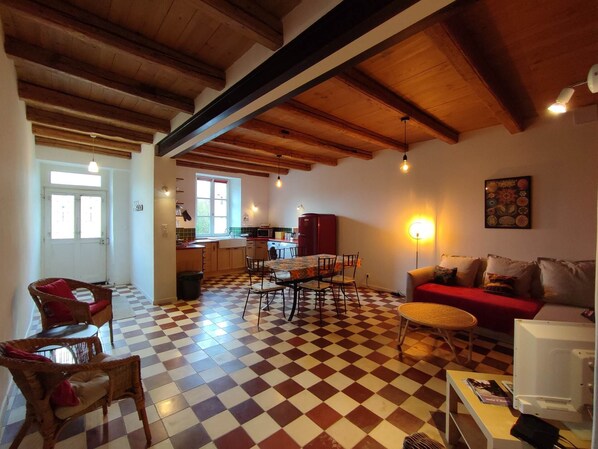 Restored in one of the castle's outbuildings dating from the 18th century, this cozy apartment offers all the charm found in old character buildings - exposed beams and cement tile floors. Ideal for families or friends of up to four people, it opens onto a large living room (40m2) equipped with a kitchen and a double sofa bed, a 20m2 bedroom (2 people) and a pretty bathroom with shower and bathtub. The view of the historic farmyard in the foreground, the privileged nature of the park beyond, invite you to follow the rhythm of time.