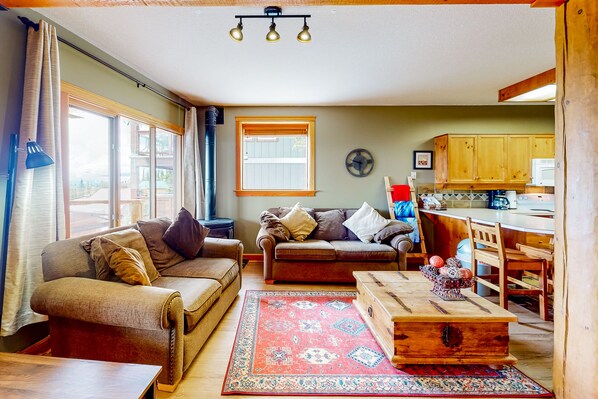 Inside, the open-concept living room, dining area, and kitchen encourage family time. Flip on the gas fireplace and tune into your favorite TV shows and movies from the comfort of the soft seating in the living room. Or, don your chef's hat and whip up delicious homemade meals in the well-equipped kitchen. When you want to escalate your cooking, utilize the provided gas grill.