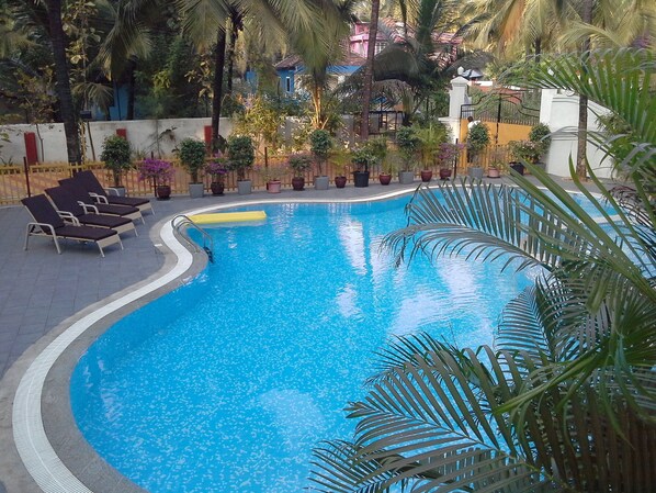 A peaceful retreat awaits near Benaulim Beach, where travelers can relax poolside, enjoy quiet reading time, and find their own personal sanctuary