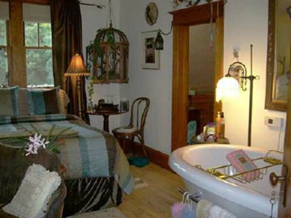 Our English Garden features a king size bed with pillowtop mattress. Relax and enjoy a spa treatment in your Thermo Masseur whirlpool tub for two. This suite has a fireplace, private water closet (bathroom) and an antique English secretary desk for your computer. An adjoining room offers two twin beds for extra guests. Our room rates are for double occupancy.