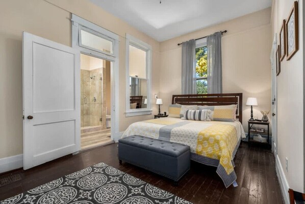 Master Suite (Main Level): King bed + en-suite bath with walk-in shower 🚿
