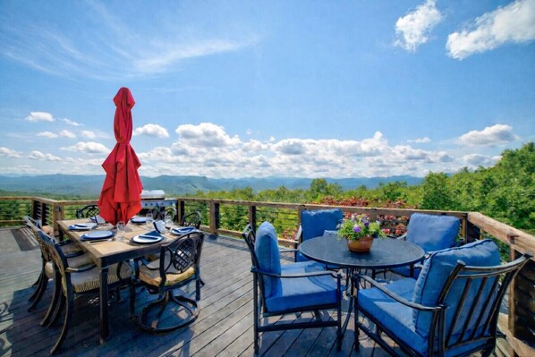 This unique Cabin offers unparalleled, breathtaking east and west scenic mountain views from sunrise to sunset. Experience the majestic, expansive feelings only the Blue Ridge mountains can provide on the private balcony, deck, or spacious patio. If it`s cold, stay inside to enjoy the home`s 5 bedrooms, 3.5 bathrooms, game area, or 2 full kitchens! Adventure is just a stone`s throw away in the Chattahoochee National Forest, and fall apple-picking at Mercier Orchards is a must!