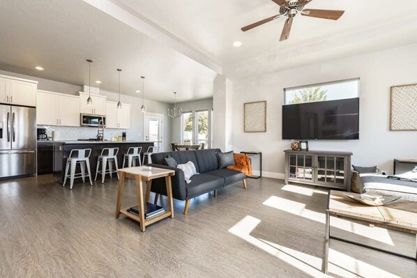 Bright and open living area featuring comfortable sectional and a sofa that converts to a sofa sleeper. Plenty of seating to relax and enjoy! Flat screen SMART TV, makes for a great night of lounging. Catch up on your favorite Netflix series or watch a movie on Amazon! Open seating area with windows bring in plenty of light and provides a comfy space for reading, playing a board game or enjoying a glass of wine.