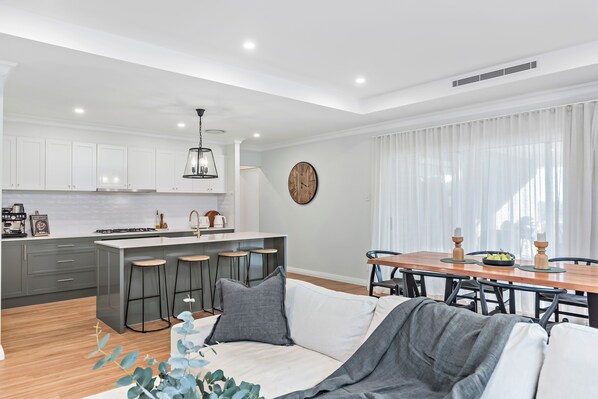 You have the entire property to yourself. Our home features a spacious open-plan living and dining area, with a country modern styled fully equipped kitchen, with coffee machine, dishwasher, oven and stove top —ideal for family meals or easy holiday breakfasts. The pantry will be lightly stocked with your essentials e.g olive oil, salt & pepper, cofee and other miscellaneous items.