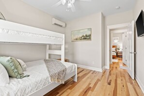 The primary bedroom holds a King bed and TV, with attached bathroom. The second bedroom holds a bunk bed with Queen size bed on bottom, twin XL on top, and available air mattress. All rooms are stocked with comfy linens, an abundance of blankets, and plenty of pillows!