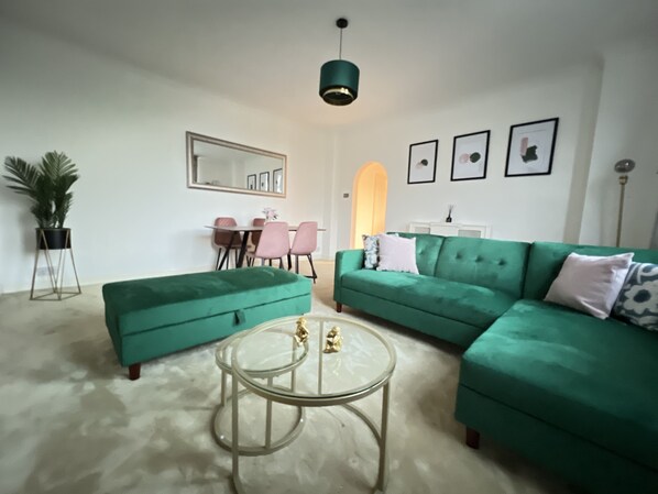 The spacious lounge offers a full-size dining table seating 6, a 50-inch smart TV, and an additional double sofa bed, ensuring a comfortable and enjoyable stay for all. Seaside Serenity is your stylish home away from home, perfect for beach lovers and city explorers alike.