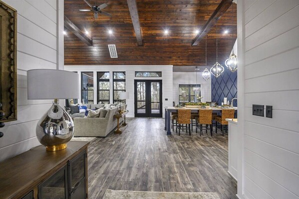 When you enter AP’s Landing through a beautiful set of French doors, you are welcomed into an open, light and bright living space decorated to the highest standards. With white walls and soaring ceilings, the living room invites it’s guests to take a moment to sit, relax, and unwind. With it’s high end sectional sofa and upholstered chairs, AP’s Landing has plenty of seating for all to enjoy the gas-log fireplace enclosed in a custom, two-toned, floor to ceiling hearth that makes a stunning statement as to the quality and attention to detail the entire cabin possesses. The smart, flat screen television located over the fireplace is perfect to gather around and watch your favorite streaming shows or the movie you have been wanted to see but were too busy to catch. This space is also ideal for playing games or just lounging around as a group and catching up with your friends and family. Plenty of windows let in large amounts of natural light to further brighten up the space and provide stunning views of the outdoors.