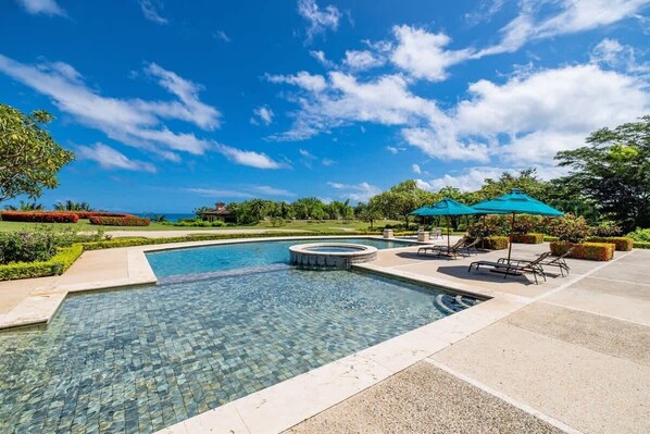 The Malinche Clubhouse, for the use of Malinche owners and guests, with infinity pool and jacuzzi, a covered outdoor sitting and dining area.