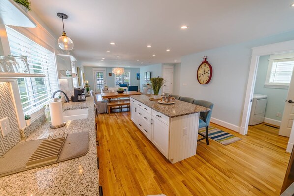 Fully stocked kitchen, dining for six and four additional chairs at the kitchen island, washer and dryer, and Wi-Fi for your home away from home. After a long fun day at the beach return to comfort and relax on the back deck and hard-scaped stone patio.