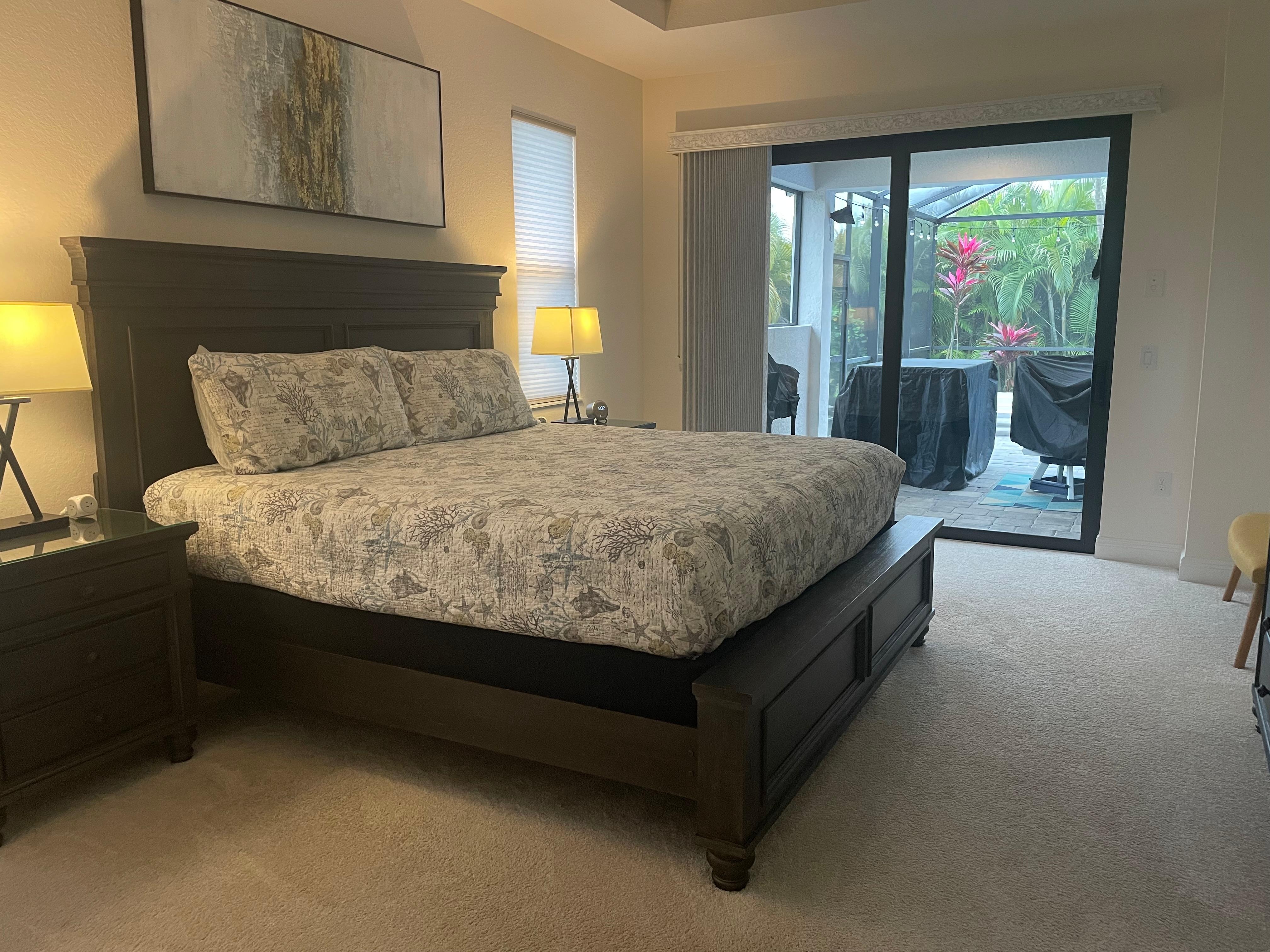 Master Bedroom/Bathroom: The master bedroom is found off of the living room and features a king-size bed, flat-screen TV, and private access to the lanai through the glass sliders. The attached master bathroom suite includes a soaking tub and walk-in shower, as well as a double-sink vanity.