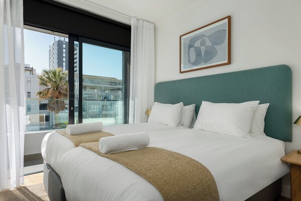 shower. The second bedroom features two single beds. The lounge offers