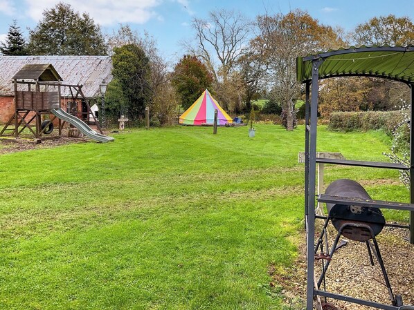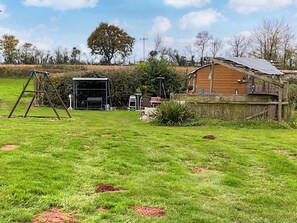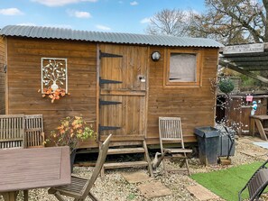 Shower Room: Cubicle Shower, Toilet. Partial, Electric central heating, electricity, bed linen, towels and Wi-Fi included. Welcome pack. Games room (shared with other properties on-site). Front garden with sitting-out area, firepit, garden furniture and barbecue. Grounds with sitting-out area, firepit and barbecue. Children’s play area (shared with other properties on-site). Hot tub for 6 (private). Private parking for 2 cars. No smoking.. Nestled in the picturesque landscape of Raglan, this charming shepherd’s hut with private wood fired hot tub offers a cosy retreat for your getaway.