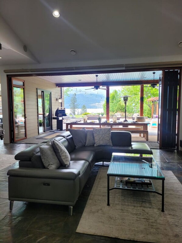 Our craftsman style rancher`s open floor plan offers plenty of room to gather, relax, and entertain. The large kitchen is equipped with plenty of counter space and seating for everyone to enjoy a meal together. Eat at our country style indoor dining table or step outside through the 20 ft expansive glass folding doors that open up to the pool area and share the meal on our 14 ft outdoor dining table.