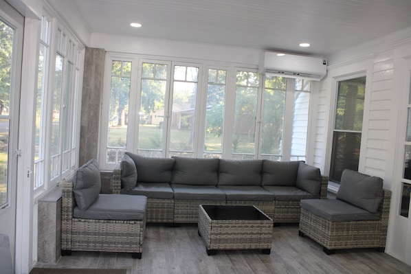 Indoor–outdoor living – The enclosed front patio is one of the home’s highlights. Walls of windows fill the space with natural light, making it the perfect spot for morning yoga or evening card games. Screened windows allow a breeze without insects in summer, and a heater keeps the space cozy when temperatures drop. Step outside to a generous backyard bordered by a privacy fence. Children have room to run and play under mature shade trees, while adults can relax in Adirondack chairs. There’s a charcoal grill for burgers and a picnic table for dining al fresco. At night, gather under the stars and tell stories about your road trip. Laundry facilities and off‑street parking are available in the detached garage, and keyless entry makes check‑in easy.