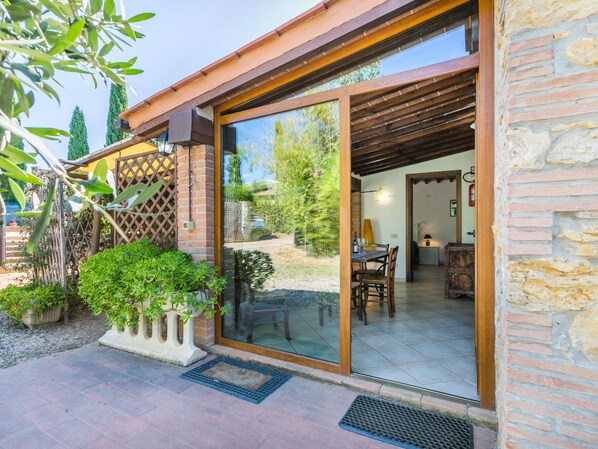 3-room house 65 m2, on the ground floor. Simple and practical furnishings: living room with TV. Exit to the veranda. Dining room with winter garden with dining table. Exit pergola. 1 double bedroom with 1 double bed, 1 sleeping facility and shower/bidet/WC. Exit to the garden. 1 double bedroom with 1 double bed. Open kitchen (oven, dishwasher, Gas stove, 4 gas rings, toaster, kettle, electric coffee machine). Shower/bidet/WC. Wood heating. Heating not available in all rooms. Patio roofed. Terrace furniture, barbecue, deck chairs (6), conservatory. Facilities: washing machine, iron. Internet (WiFi). Please note: maximum 2 pets/ dogs allowed. Smoke alarm, fire extinguisher. IT050006C2783K5BJL