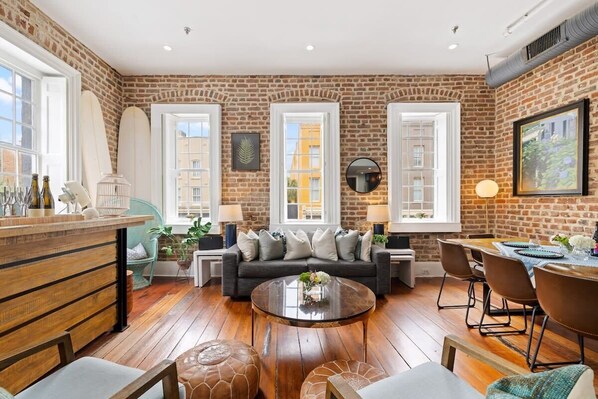 The gracious living room features exposed interior brick, original heart pine hardwood floors and 18' ceilings. The dining area features a live-edge dining table with seating for 8 plus, a full bar with seating for 4 more and ample seating for additional guests throughout. A high-end SONOS sound system controlled by iPad and a 75" flat screen TV with premium channels lend to a common area perfect for comfortably entertaining up to 14 guests.
