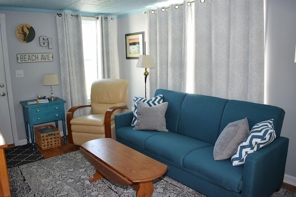 This charming cottage features a lovely eat-in kitchen fully equipped with all amenities, a cozy living room with a full sleeper sofa and recliner, and a queen bedroom with an adjacent full bathroom. A large front porch offers a perfect spot for outdoor dining and relaxing.
