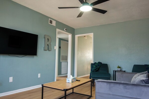 The living area is located on the main level and offers a Phillips Smart TV to stream your favorite shows or movies.