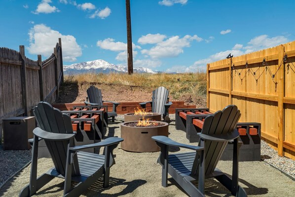 Stunning Front Yard: Follow the path to an amazing fire pit area with comfortable seating and breathtaking views of Pikes Peak and the Rocky Mountains. It’s the perfect spot for magical Colorado evenings.