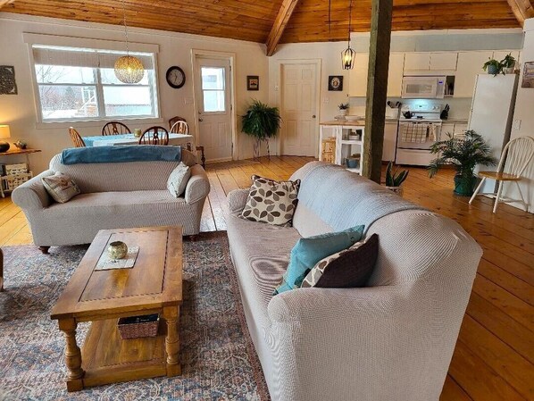 The cottage is absolutely as described. The indoor and outdoor living space is great for a group and just a short walk to the water. The property and cottage are clean and inviting. Bedrooms on either side of a large open living room/dining room/kitchen give just enough separation. The weather was just starting to get cooler and the furnace kept us toasty warm. Thank you for a wonderful space to relax and get comfy.