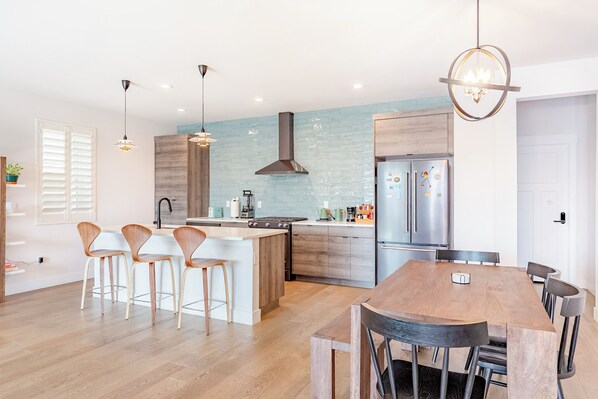 • Large quartz kitchen island with designer walnut counter stools and designer pendant lights.