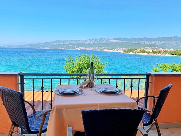 This charming first-floor apartment is ideal for a relaxing getaway, just 40 meters from the sea and a beautiful sandy beach. Enjoy breathtaking panoramic sea views from the 6 m2 private balcony, the perfect spot for morning coffee or sunset drinks. The apartment comfortably accommodates 2 to 3 people, featuring a separate bedroom with a queen-sized bed, and a sofa bed in the living area that sleeps one additional guest. The bathroom includes a shower, toilet, and hairdryer for your convenience. The open-plan living, dining, and kitchen area creates a welcoming and functional space. The fully equipped kitchen includes an electric/gas stove, oven, fridge with freezer compartment, coffee machine, water kettle, and toaster, making meal preparation a breeze. For your comfort and entertainment, the apartment offers air conditioning, satellite TV, and free Wi-Fi. Additionally, a restaurant is conveniently located on the ground floor of the building, offering delicious local cuisine just steps from your door. Whether you're looking to relax by the sea or explore the local area, this apartment is a perfect home base for your summer escape.