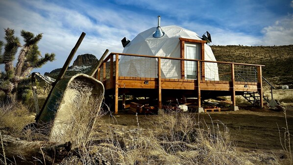 Enchanting Geodesic Dome with Mountain Views and natural desert surroundings.