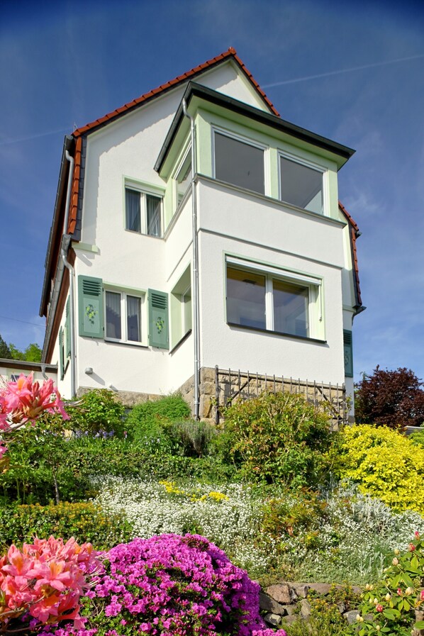 Our bright, newly renovated vacation home enchants with a fantastic view over the beautiful Elbe valley to the Elbe Sandstone Mountains, which you can enjoy at any time of the year on the glazed verandas. The very quiet location and the lovingly furnished living rooms and bedrooms as well as the modern, generously equipped kitchen make for a relaxing and comfortable stay. Relax in the covered outdoor seating area with garden furniture and barbecue after a city or hiking tour. Dresden shines not only with its many historic palaces, churches and magnificent buildings, but also with its excellent cultural offerings and the "Großer Garten" with park railroad and gondola pond. Hiking trails through the royal Saxon vineyards to Pillnitz, the Meixgrund or the Borsberg are right on the doorstep and the historic old town of Dresden and the Elbe Sandstone Mountains can be reached quickly by car, bus or, for those who like it more romantic, by Saxon steamboat. Cycle tours on the Elbe cycle path to the old town, past the famous Canalettoblick or via Pirna to Rathen in Saxon Switzerland are scenically unique. Worthwhile destinations are the Amselsee, the Rathen rock stage or a hike through the Schwedenlöcher to the Bastei. Visit us and get to know Dresden and its beautiful surroundings. We look forward to seeing you.