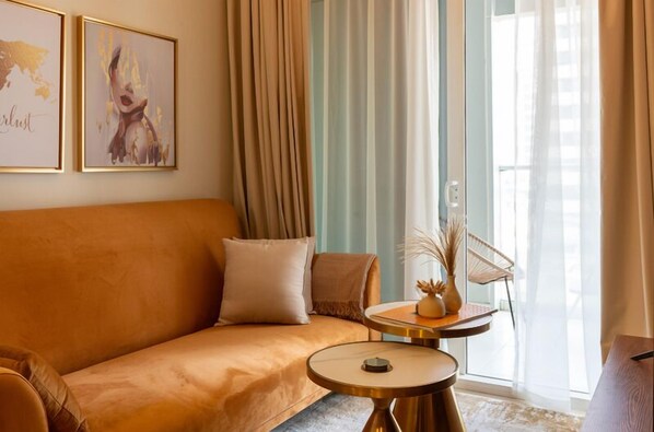 このアパートメントの客室は外通路からアクセスでき、冷房、セーフティボックス、ボトルウォーター (無料)が備わっています。 客室には、バルコニーがあります。客室には独立した応接スペースがあり、ダイニングテーブルが備えられています。低反発マットレスのベッドには 羽毛の掛け布団、高級寝具を使用しています。キッチンには、大型冷蔵庫 / 冷凍庫、コンロ、電子レンジ、独立したダイニングスペースがあります。バスルームには、レインフォールシャワーを備えたシャワー、ビデ、ヘアドライヤーがあります。