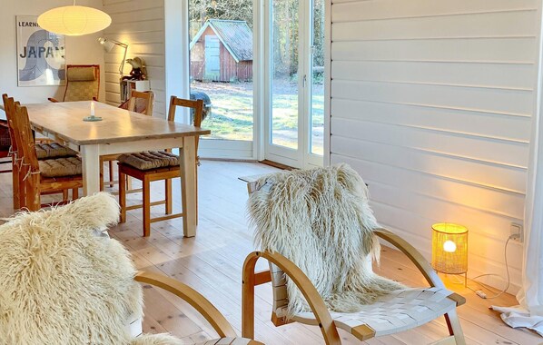 Look forward to a relaxing holiday in this charming wooden house, which welcomes you with its warm atmosphere and idyllic location. In the small village of Fuglslev, you will spend your holiday in peaceful surroundings, surrounded by woods and meadows. Step inside and enjoy the cosy ambience with light-coloured wooden walls and wide window fronts. Make yourself comfortable on the sofa in the living room and feel the warmth of the crackling fireplace. The open-plan kitchen is modernly equipped and has everything you need to prepare meals together. The large dining table with a view of the garden is a wonderful place to sit together, play games or plan the day.