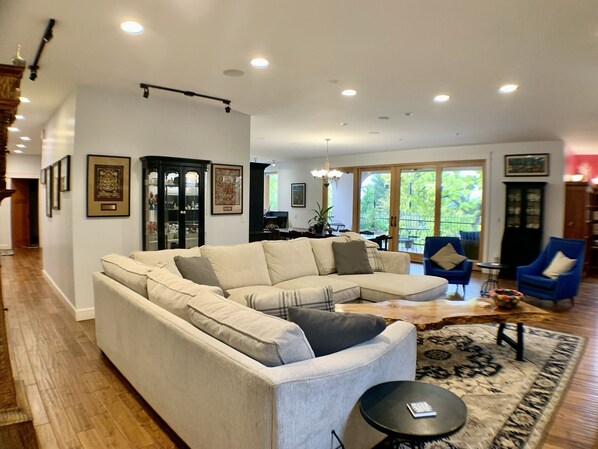 The heart of the home lies in the chef's kitchen, equipped with a top-of-the-line Wolf double oven gas range, Viking refrigerator, and an ice maker. A baker's nook beckons culinary creativity, while a laundry center featuring two front-loading extra capacity washers/dryers ensures convenience.