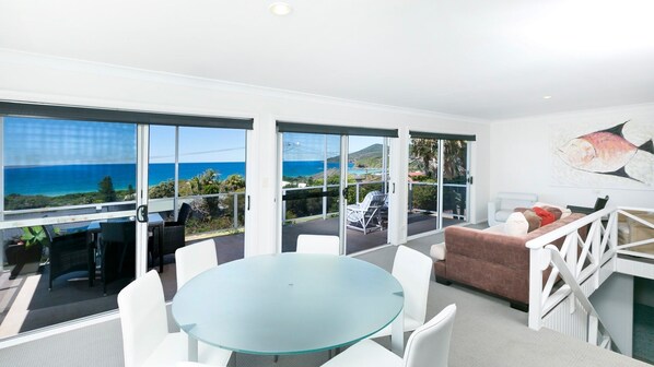 The upper level of this airy coastal home makes the most of the views over One Mile. The open plan living and dining room opens onto the covered ocean balcony. Wi-Fi and Foxtel come included for your enjoyment.