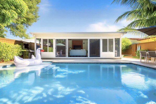 Enjoy the serene backyard with a heated saltwater pool, grill, umbrellas, and chaise lounges.