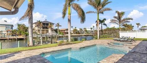 Latitude Adjustment, in the prestigious Siesta Isles of Fort Myers Beach, offers an inviting retreat with water views and short access to the gulf. Relax by the pool with outdoor furniture or lounge on one of two living room sectionals upstairs. The gourmet kitchen is perfect for entertaining and a second downstairs kitchen offers additional convenience.