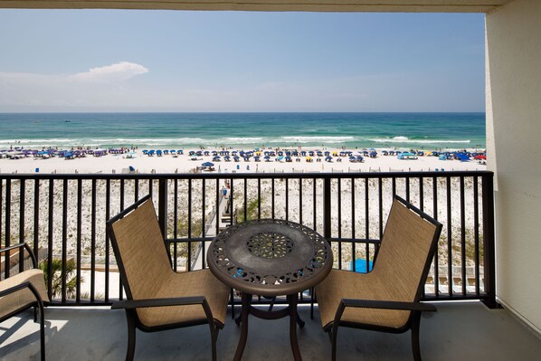 This gulf front, 2 bedroom/2 bathroom condo includes: A fully stocked kitchen for preparing meals, a separate dining area, and a breakfast bar. A living room with a queen size sleeper sofa for extra guests, a flat screen TV, and a private balcony with direct gulf views. A master bedroom with a king size bed, flat screen TV, and private bathroom. A second bedroom with a bunk bed that includes a full-size bed on the bottom bunk and a twin-size bed on the top bunk. A second full size bathroom in the hallway. Washer and dryer in unit.
