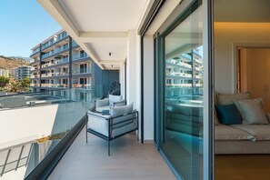 The first bedroom is an ensuite with a plush king-sized bed and wardrobe, while the second bedroom also has a king-sized bed and wardrobe. Both rooms feature hotel-quality linens for maximum comfort and access to a private balcony.