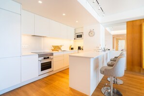 The kitchenette includes an electric hob, oven, microwave, coffee machine, cookware, and cutlery, so you can easily prepare home-cooked meals.