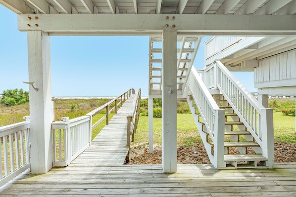 The ground level entertainment area welcomes you with a shaded patio, complete with a charcoal grill and a built-in picnic table, perfect for enjoying delightful outdoor meals. There’s also a sun deck and large back yard. After a day at the beach (easily accessible via the private dune walkover), rinse off in the refreshing outdoor shower before heading upstairs to continue the fun in the deck-level pool.