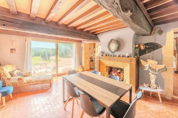 Charming farmhouse with swimming pool - calm & natureでは、独立したダイニングスペースのほか、WiFi (無料)、デスクチェアなどの快適な設備・サービスを全室でご利用いただけます。